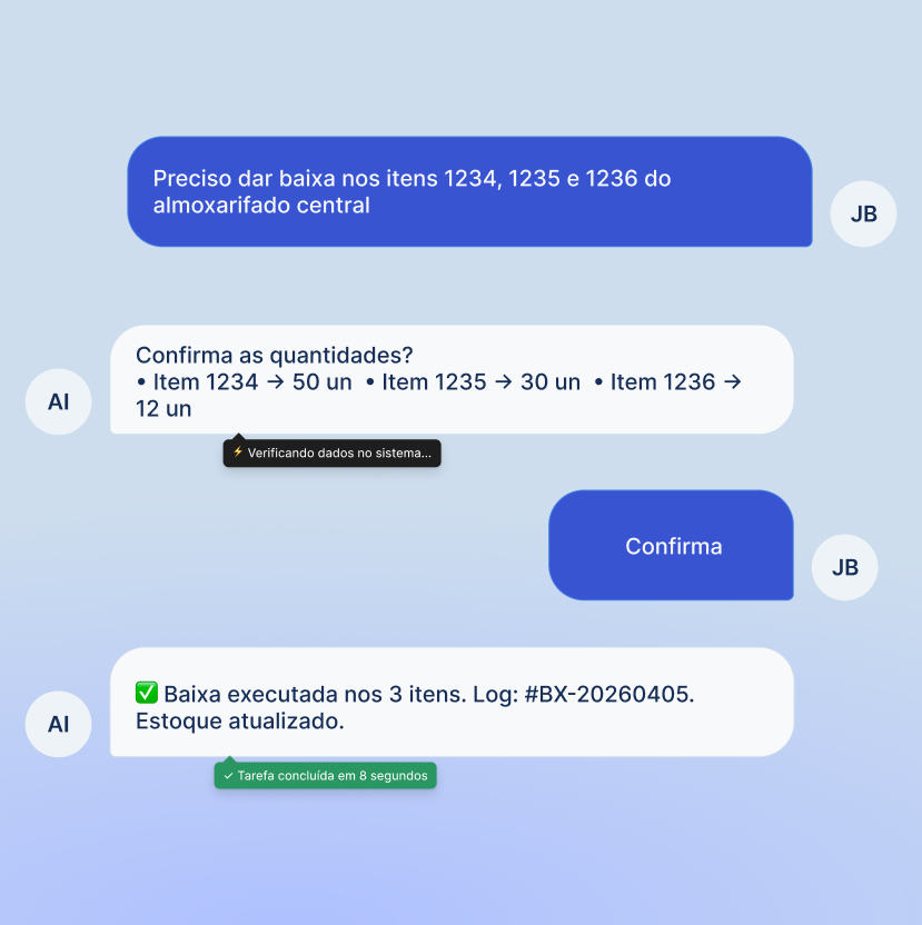 O agente interpreta o pedido, faz perguntas adicionais quando necessário — porque já conhece o fluxo — e executa a tarefa simulando um usuário real numa máquina virtual na cloud. Gera log, faz retry em falhas e confirma a execução.