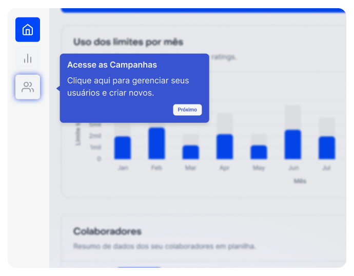 Guie o seu cliente dentro do módulos e funcionalidades e garanta que ele tenha a melhor experiência ao conhecer o seu produto.